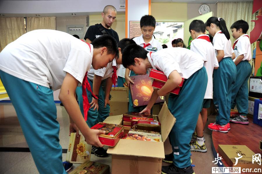 東風(fēng)東路小學(xué)的學(xué)生在清點(diǎn)月餅(央廣網(wǎng)記者 鄭澍 攝)