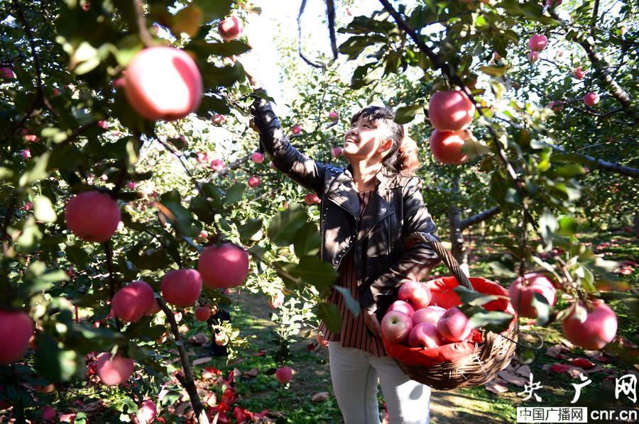 央廣網(wǎng)北京10月23日消息(記者李文蕊 通訊員鄭學(xué)偉)日前,北京延慶香營鄉(xiāng)千余畝蘋果成熟上市,吸引眾多游客前來采摘購買。這里是北京延慶果品大鄉(xiāng),該地區(qū)位于山前暖光帶,光照充足、晝夜溫差大,是優(yōu)質(zhì)蘋果產(chǎn)區(qū),生產(chǎn)的蘋果具有果型正、個(gè)頭大、品質(zhì)好、口感好、耐儲(chǔ)存等特點(diǎn),主要品種有富士、國光、葵花、勝利。圖為游客在采摘有機(jī)蘋果。