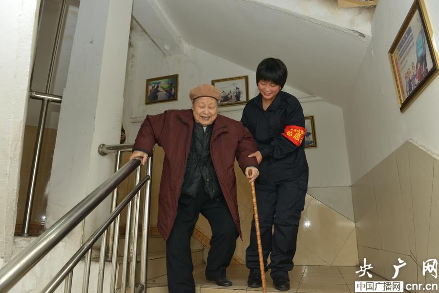 志愿者接警后攙扶老人下樓(央廣網(wǎng)記者 陳鵬 攝)