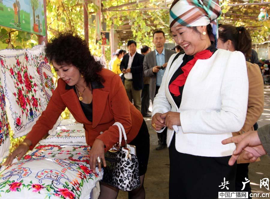 新疆庫車縣墩坦闊鎮(zhèn)舉辦農(nóng)家婦女刺繡作品展(央廣網(wǎng)記者 張雷 攝)