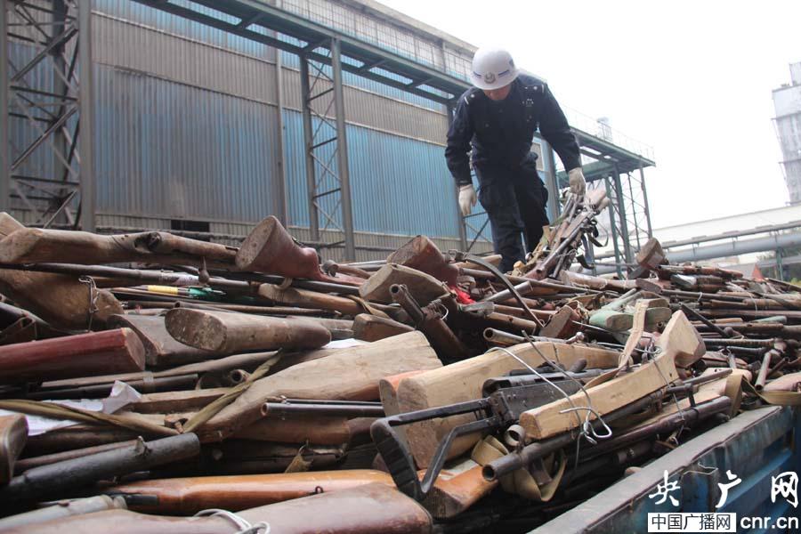 央廣網(wǎng)蘭州10月31日消息(記者焦健 王居蔚)伴隨著煉鋼爐中騰起的一團(tuán)烈火,爐內(nèi)的非法槍支已經(jīng)瞬間化為鐵水。煉鋼廠門口的空地上五輛滿載著非法槍支的大卡車一字排開。車上的一萬(wàn)余支非法槍支正等待著同樣的命運(yùn)。今天上午,甘肅省公安廳在蘭州榆中鋼廠對(duì)“緝槍治爆”專項(xiàng)行動(dòng)中收繳的12252支非法制造的火藥槍、獵槍、氣槍,7568支仿真槍、8967把管制刀具予以安全銷毀。