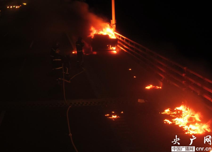 杭州灣跨海大橋一貨車自燃變“火車” (央廣網(wǎng)發(fā) 曹美麗 攝)
