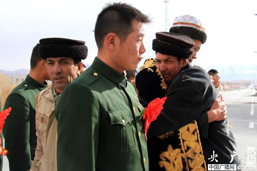 駐地塔吉克族農(nóng)牧民群眾與退伍老擁抱告別(央廣網(wǎng)記者 張雷 攝)