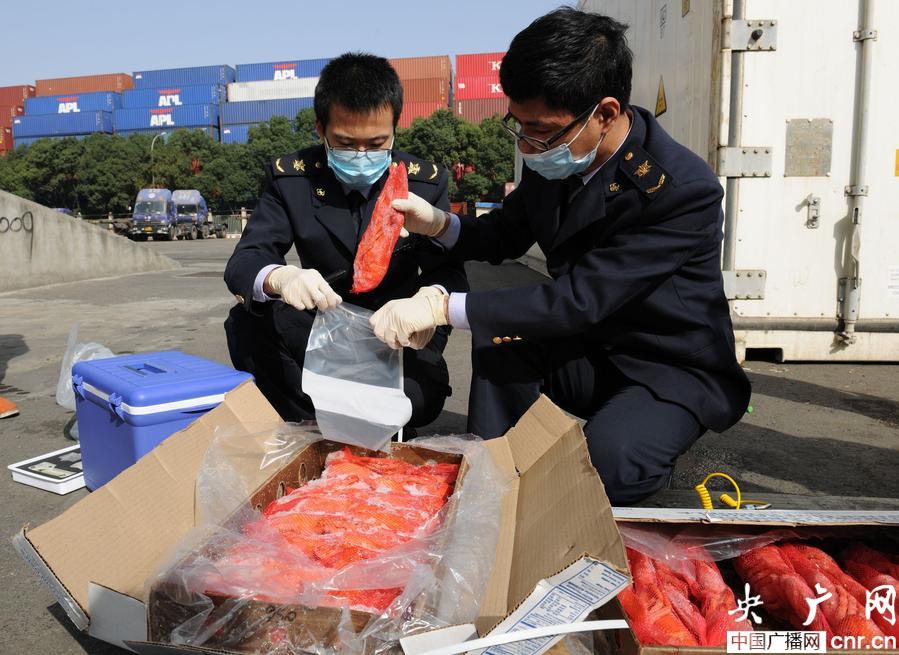 檢驗(yàn)檢疫人員正在取樣(央廣網(wǎng)發(fā) 杜金明 攝)