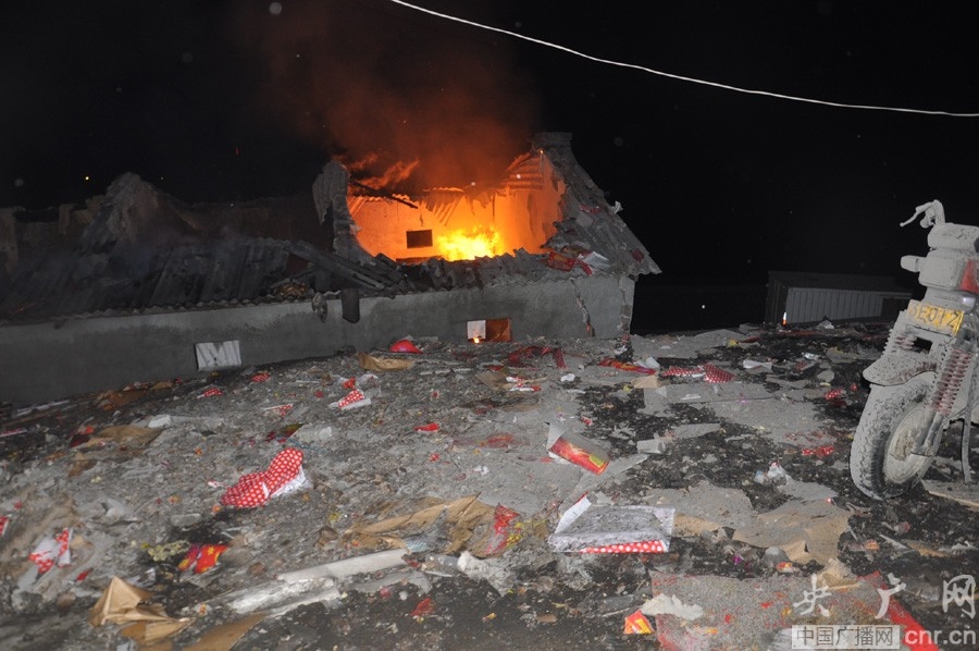 凌晨4時18分,消防官兵到達現(xiàn)場后,發(fā)現(xiàn)煙花廠上空火光沖天,爆炸聲連續(xù)不斷,現(xiàn)場一片混亂。現(xiàn)場指揮員迅速命令進行火場偵查及詢問在場知情人,經(jīng)偵查及詢問知情人得知:漢江煙花爆竹廠內(nèi)部共分5個梯段,爆炸部位位于漢江煙花爆竹廠第三梯段煙花爆竹加工車間,車間內(nèi)存放大量煙花爆竹,劇烈的爆炸致使加工車間5間廠房夷為平地,北側圍墻被沖擊波掀翻,周圍50米內(nèi)居民樓房玻璃大量碎裂。