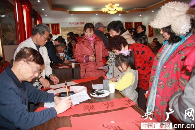 大廳里,鐵絲上懸掛著數(shù)百幅紅彤彤的春聯(lián)供村民挑選。十里八村的鄉(xiāng)親在挑選春聯(lián)時(shí)尤其對(duì)“追風(fēng)赤兔長(zhǎng)辛店;踏雪尋梅園博園“和“寶塔祥光映村社;園博生輝潤(rùn)田園格外青睞;顒(dòng)中,剛剛建成的長(zhǎng)辛店鎮(zhèn)園博書畫社揭牌。在隨后“草根書法家“文化入村行動(dòng)中,幾十名當(dāng)?shù)貢◥?ài)好者乘坐掛有“長(zhǎng)辛店文化大篷車,送福到農(nóng)家”的面包車分赴九個(gè)行政村為農(nóng)民寫春聯(lián)。