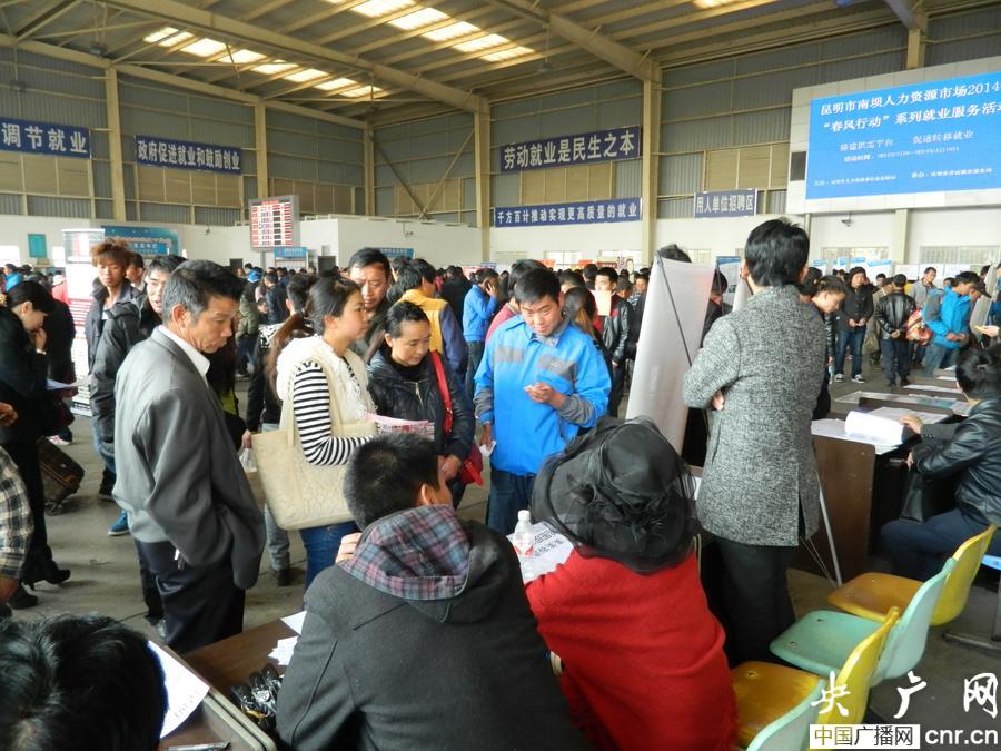 昆明市南壩人力資源招聘市場這幾天人頭攢動、非常熱鬧,恰逢春節(jié)后集中用工和求職的高峰期,每天都有近5000人來找工作,而招工單位也超過了450家,共提供了3800多個崗位,工種以服務(wù)員、洗碗工、廚師、保安等服務(wù)類為主。二十歲出頭的謝興周11號這天第一次來到招聘市場,他的意向工作是司機,他認為隨著物價上漲,去年大概2800元的工資今年應(yīng)該至少漲到3000元才能達到心理預(yù)期。