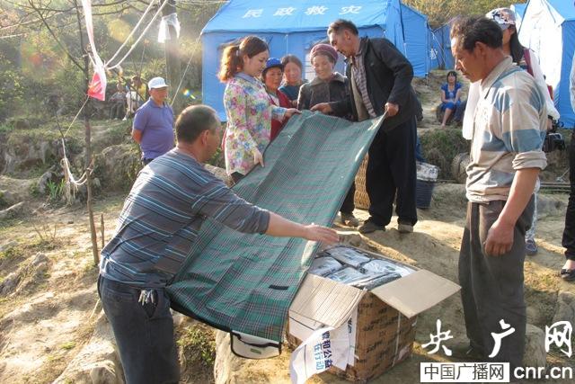 災(zāi)民拿到了愛心企業(yè)送來的防潮墊(央廣網(wǎng)發(fā) 王澎 攝)