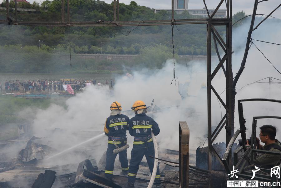 13時51分,綿陽市119指揮中心接到群眾的報警后,迅速調派6輛消防車、34名官兵趕往現(xiàn)場滅火。筆者趕到現(xiàn)場時,明火已經(jīng)被控制,消防官兵正在清查火點。筆者看到,失火的茶莊位于三江江邊,整個茶莊僅剩茶水間,所有棋牌室均被燒垮。據(jù)先前趕到現(xiàn)場的御安街消防中隊指導員王鵬介紹,他們到場后迅速鋪設了四條水帶并出四支水槍,分別從上風方向和側風方向出水,阻止火勢向毗鄰的西昌竹簽燒烤蔓延。同時,設置2臺手抬機動泵直接從三江抽水,確;饒鲇盟婚g斷。