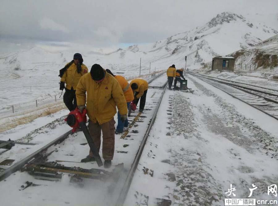 烏斯特車站鐵路員工認真清理積雪保障安全 (央廣網發(fā) 姚旭東攝)
