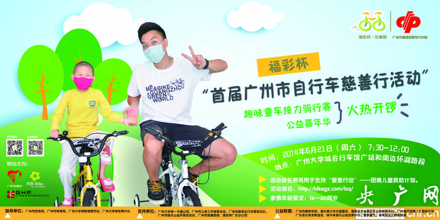 央廣網(wǎng)廣州5月22日消息(記者何偉奇 通訊員文燕媚)經(jīng)廣州市政府同意,廣州市慈善會、廣東省千禾社區(qū)公益基金會、拜客廣州將于2014年6月21日上午,在廣州大學(xué)城自行車館廣場及環(huán)湖路段舉辦福彩杯首屆廣州市自行車慈善行活動,為廣州市慈善會“愛蕾行動”——困境兒童救助計劃籌集善款。