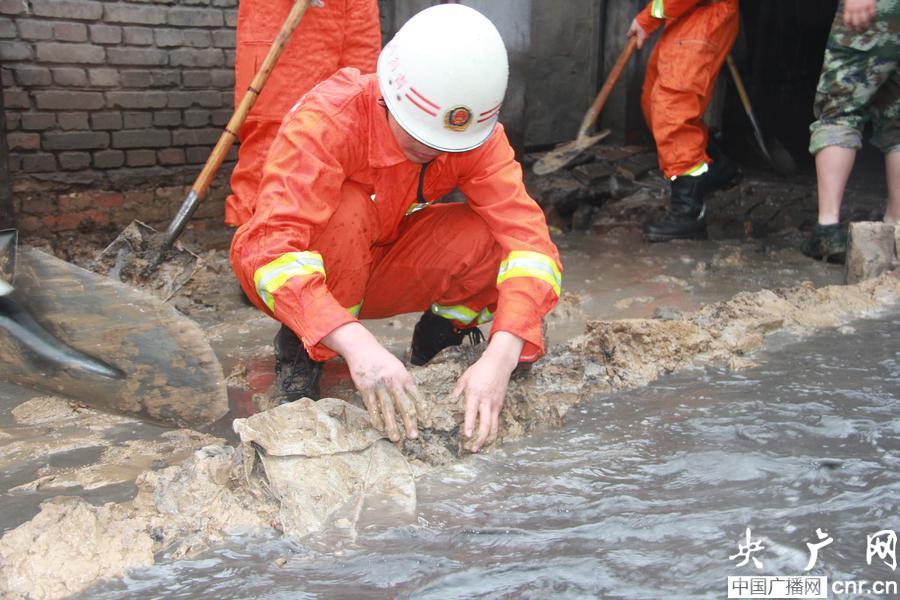 消防戰(zhàn)士徒手構(gòu)筑攔水壩(央廣網(wǎng)記者 葛修遠(yuǎn) 攝)