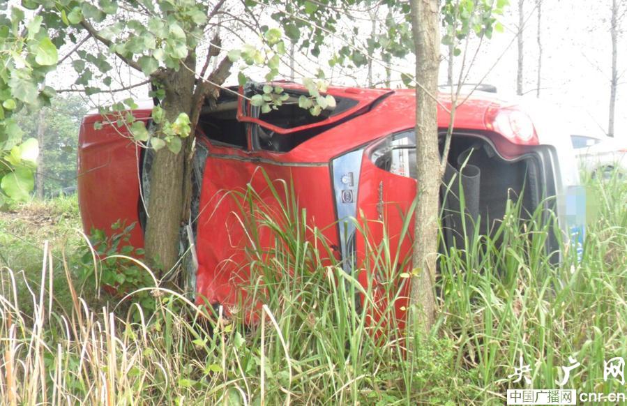 據(jù)司機張某介紹,當(dāng)日下午他正載著四位乘客沿通江大道往蕪湖市送客,車至事發(fā)路段時,突然看到車子前方有一只流浪狗跑過,距離很近。張某頓時嚇了一跳,連忙猛打方向,接著就踩剎車。沒想到,這一腳剎車踩下去,車子頓時側(cè)翻并打了個滾。他們從車?yán)锱莱鰜頃r,發(fā)現(xiàn)車子已經(jīng)滾到路邊撞倒行道樹上。