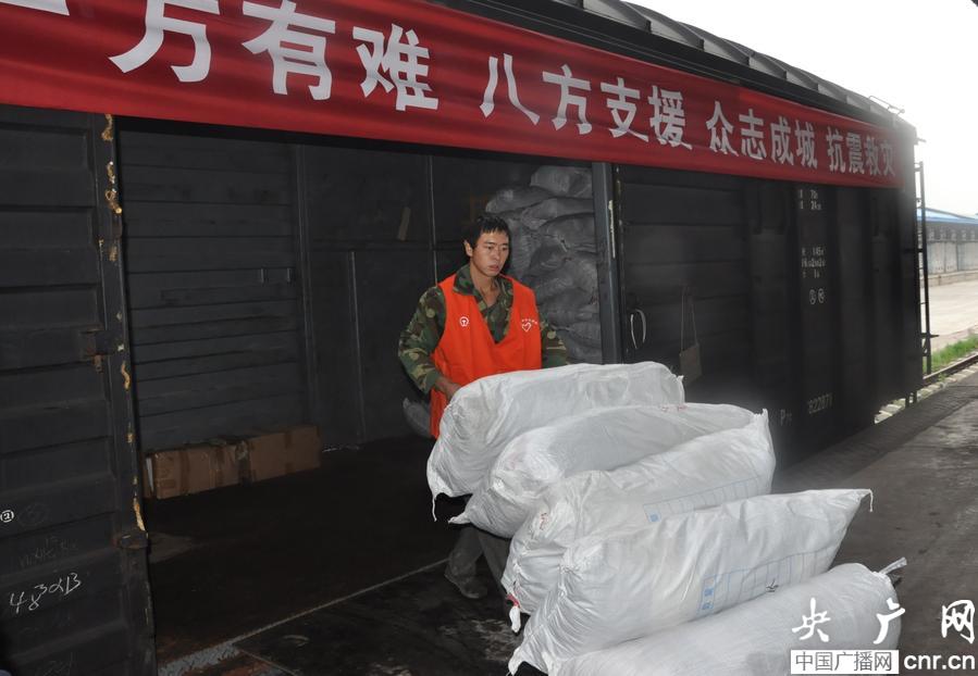 成都鐵路局搶卸第一批運(yùn)抵云南昭通的衣物(央廣網(wǎng)發(fā) 吳正琪 攝)