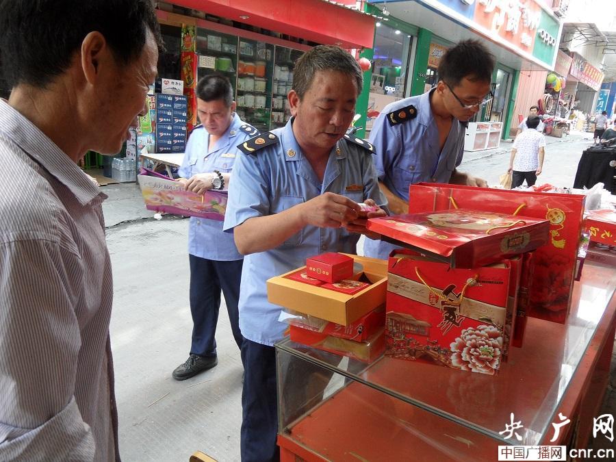 執(zhí)法人員當(dāng)場查扣“三無”月餅(鄭聰明 攝)(央廣網(wǎng)記者 陳庚 攝)
