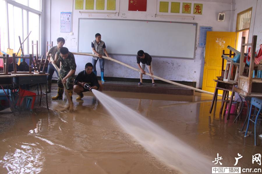 巫溪縣消防大隊(duì)官兵一大早就趕到了學(xué)校,消防官兵首先對(duì)學(xué)校食堂、教室、宿舍進(jìn)行了清洗。記者看到,消防官兵沖刷過(guò)的地面比原來(lái)干凈了許多,消防官兵和學(xué)校工作人員正拿著掃把和水槍,在教室內(nèi)一邊沖洗一邊刷地,將教室一間一間的沖洗干凈。