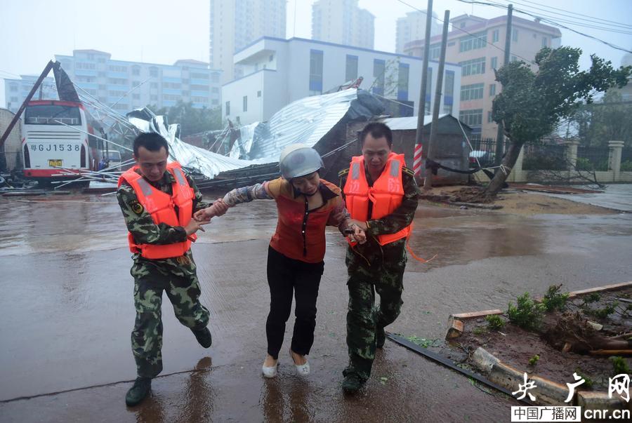 央廣網(wǎng)湛江9月16日消息(記者鄭澍 通訊員廖鍵 錢夢秋 攝影廖鍵 錢夢秋)據(jù)氣象部門消息,今年第15號臺風(fēng)“海鷗”已于16日12時45分,在廣東湛江徐聞縣南山鎮(zhèn)五里村沿海地區(qū)二次登陸,登陸時中心最大風(fēng)力13級。 9月16日下午15時左右,廣東邊防總隊湛江支隊徐聞邊防大隊官兵在海安大道巡邏搜救時,在一處被吹倒的鐵皮房內(nèi)發(fā)現(xiàn)了一名50歲左右的張姓婦女正躲在角落哭泣;邊防官兵立刻將其救回巡邏車,并將其送回家中。該婦女一邊擦著眼淚一邊不停的感謝道:“我已經(jīng)在里面待了十幾分鐘了,如果不是你們,真不知道該怎么辦”。據(jù)悉,該婦女因為不放心老父親一人在家,特意從夫家騎摩托車趕回,但是因風(fēng)雨太大,無奈只能躲進(jìn)了路邊的鐵皮房中,卻沒有料到,臺風(fēng)將鐵皮房刮倒,所幸遇到邊防官兵巡邏將其救回。