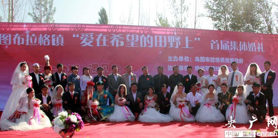 集體婚禮現(xiàn)場,在浪漫音樂的輕奏下,鮮艷的國旗被藍(lán)天勾勒出美麗的輪廓,維、蒙、漢、哈、回5個民族12對新人和2對金婚夫婦手拉手在國旗下宣誓,放飛和平鴿,攜手倡導(dǎo)文明,守護(hù)和諧家園,祝福祖國安定和諧。現(xiàn)場還表演了《博爾塔拉我的愛》大型集體舞和傳統(tǒng)麥西萊甫舞蹈,婚宴則是用新疆民族風(fēng)味的大鍋抓飯?zhí)娲,充分體現(xiàn)了節(jié)儉辦婚禮。
