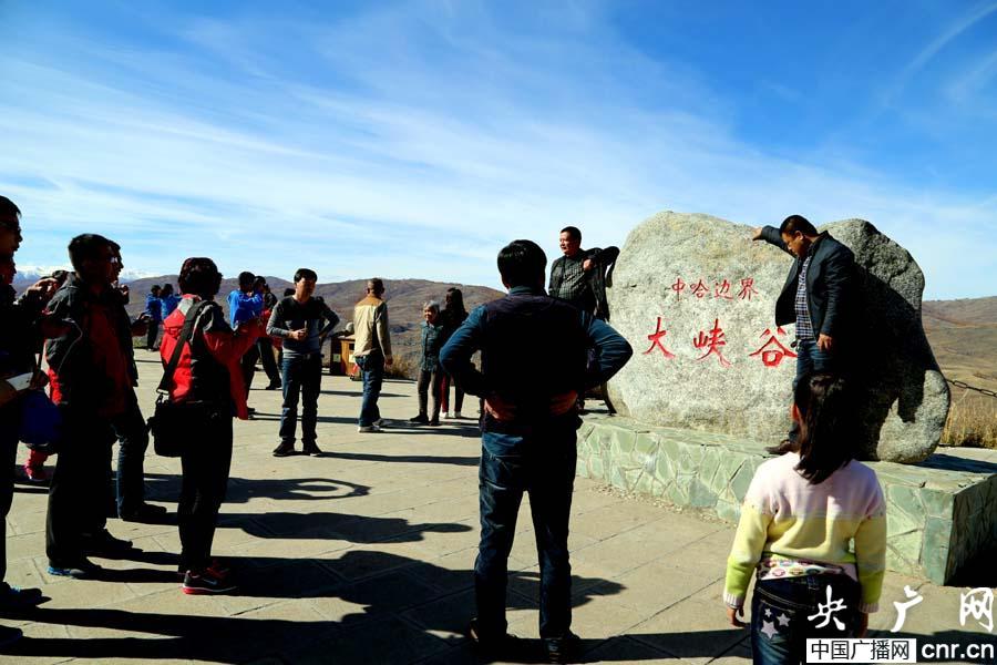 游客爭相在白哈巴景區(qū)中哈邊界大峽谷留影(央廣網(wǎng)記者 張雷 攝)