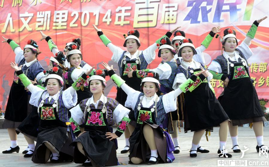 2014年12月26日,貴州省凱里市苗族農(nóng)民載歌載舞慶祝貴州首屆農(nóng)民廣場舞大賽舉行。 (央廣網(wǎng)發(fā) 姜澤鵬 楊秀福攝)