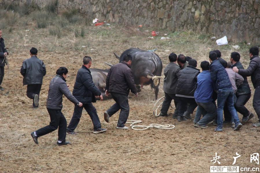 央廣網(wǎng)錦屏1月2日消息(記者王珩 孟海通訊員石福濤 楊。2015年1月1日14時許,在貴州錦屏縣彥洞鄉(xiāng)黃門村的斗牛場,隨著斗牛協(xié)會會長王明益的一聲尖銳哨聲的吹響,前來觀看斗牛比賽的二十來個年輕侗寨小伙涌入牛場,兵分兩組將一對打斗了三分余鐘還分不出勝負(fù)的水牛拉住,這是錦屏2015年元旦節(jié)期間黃門侗寨舉行斗;顒拥囊唤恰