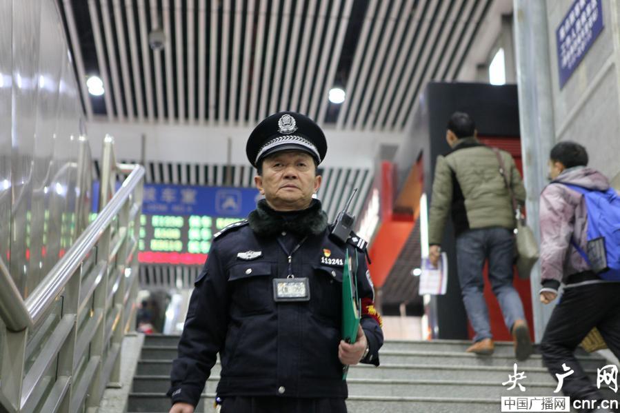 央廣網(wǎng)貴陽2月11日消息(記者王珩 陳玉 通訊員郭紅攝)“老李啊,這些東西堆在這里,把消防通道堵啦,馬上叫人來搬走!”“小伙子,別拿根煙聞來聞去過干癮,等下忍不住想抽就麻煩了,這地方抽煙有啥后果你清楚啊!”春運(yùn)中,在貴陽火車站,隨時(shí)可以看到一位皺紋滿臉、拿著文件夾匆匆穿梭的老民警身影,聽到這樣殷殷叮囑的話語。