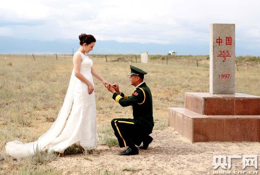邊檢警官木拉提在界碑為愛人戴上結(jié)婚戒指(央廣網(wǎng)發(fā) 董紅太攝)