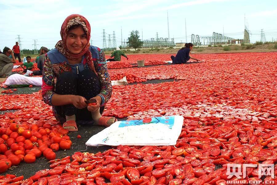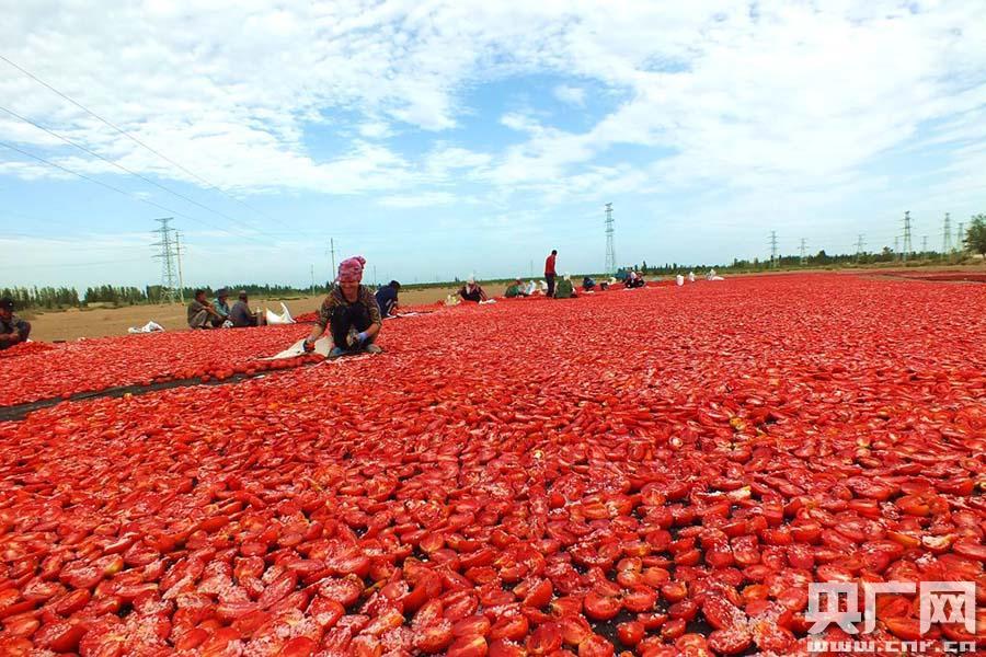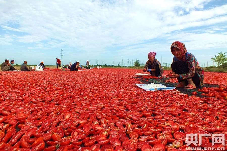央廣網(wǎng)焉耆8月6日消息(記者張雷、通訊員阿里木江.毛拉肉孜) 這幾天,新疆焉耆回族自治縣良種場(chǎng)農(nóng)民正忙著在戈壁灘上晾曬番茄干,“紅彤彤的番茄干”映紅農(nóng)民增收路。