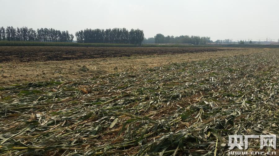 9月14日上午,村民劉維杰家的7畝多玉米被村干部帶領(lǐng)100多名不明身份社會(huì)人員開(kāi)收割機(jī)全部毀掉。(央廣網(wǎng)記者 劉穎超 攝)