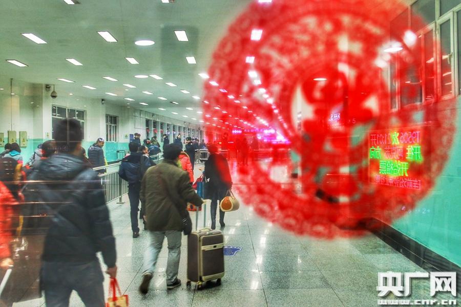 2月7日晚上20時(shí),透過烏魯木齊南站進(jìn)站通道的新年窗花看到,雖然已是除夕,坐火車出行的旅客依然不少。當(dāng)日,烏魯木齊站累計(jì)發(fā)送旅客3.7萬(wàn)人,較去年同期增長(zhǎng)13%。(央廣網(wǎng)記者 何微 攝)