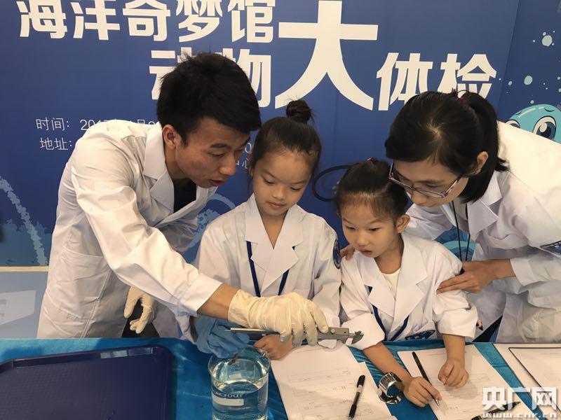 在海洋館工作人員的帶領(lǐng)下,三名小小體檢員認(rèn)真地記錄數(shù)據(jù)。