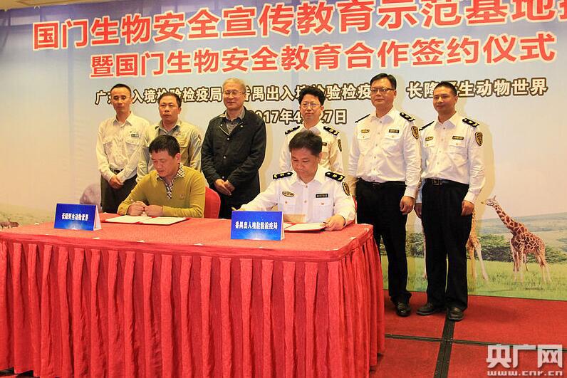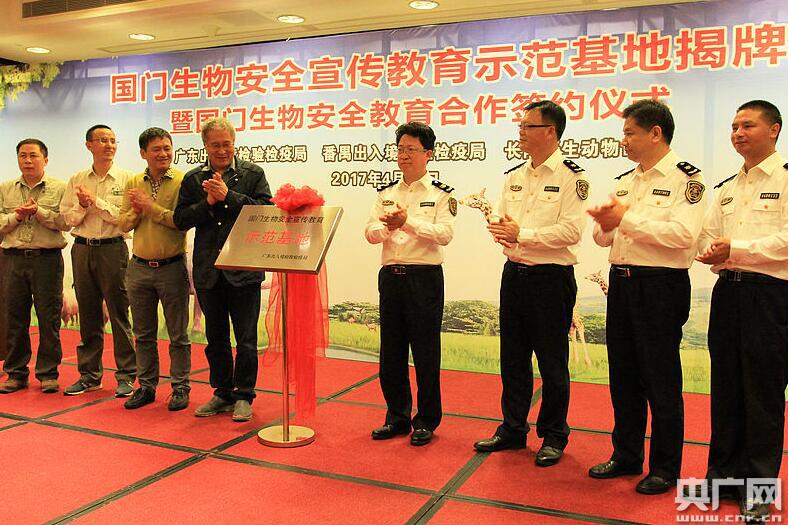 央廣網(wǎng)廣州4月27日消息(記者周羽 通訊員岳儉宣)4月27日,廣東檢驗檢疫局國門生物安全宣傳教育“示范基地”揭牌暨國門生物安全宣傳教育合作簽約儀式在廣州長隆野生動物世界舉行。廣東檢驗檢疫局副局長楊國海、長隆野生動物世界總經理董貴信共同為國門生物安全宣傳教育“示范基地”揭牌,番禺檢驗檢疫局局長劉權叨與長隆野生動物世界副總經理謝杰簽署了國門生物安全教育合作協(xié)議。