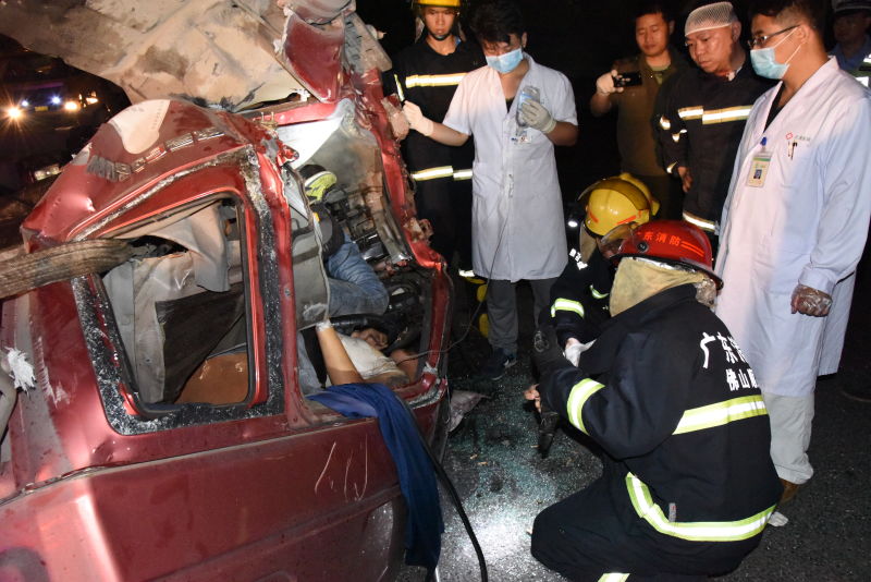 凌晨4時20分,北滘?qū)B毾狸犣s到現(xiàn)場后,發(fā)現(xiàn)現(xiàn)場出事車輛為1輛大拖頭貨車,車上存放一大批質(zhì)量較大的機器設備和貨物,當行駛到出事地點時,由于司機剎車太急,車身里存放的貨物釋放出巨大的緩沖力并沖向駕駛室,駕駛室瞬間被壓垮,司機腹部以下身體被卡,根本無法動彈,現(xiàn)場情況十分危急。根據(jù)現(xiàn)場情況,北滘?qū)B毾狸牭綀鱿狸爢T立即展開救援行動:采用操作液壓擴張器撐開車頭機件,找準鋼索著力點,使用消防車對駕駛室進行牽引,仍無法打開車門,后采用液壓鉗剪斷車門變形部位,操作液壓擴張器進行撐頂使得方向盤不再擠壓司機腹部。隨后,消防隊員拆除駕駛位座椅,使得施救空間變大,為找準司機雙腳受困位置,一名消防隊員脫下頭盔,探頭尋找司機受困部位,導致車內(nèi)金屬機件刮傷頭部,造成一道約7公分傷口,經(jīng)過簡單處理后,再次投身救援。利用液壓擴張器進行撐頂,最后將司機雙腳慢慢抽出并成功救出駕駛室,經(jīng)過兩小時的緊張救援,北滘?qū)B毾狸犼爢T順利將被困人員救出,并小心翼翼的將傷者抬上擔架后由醫(yī)護人員送往醫(yī)院救治。