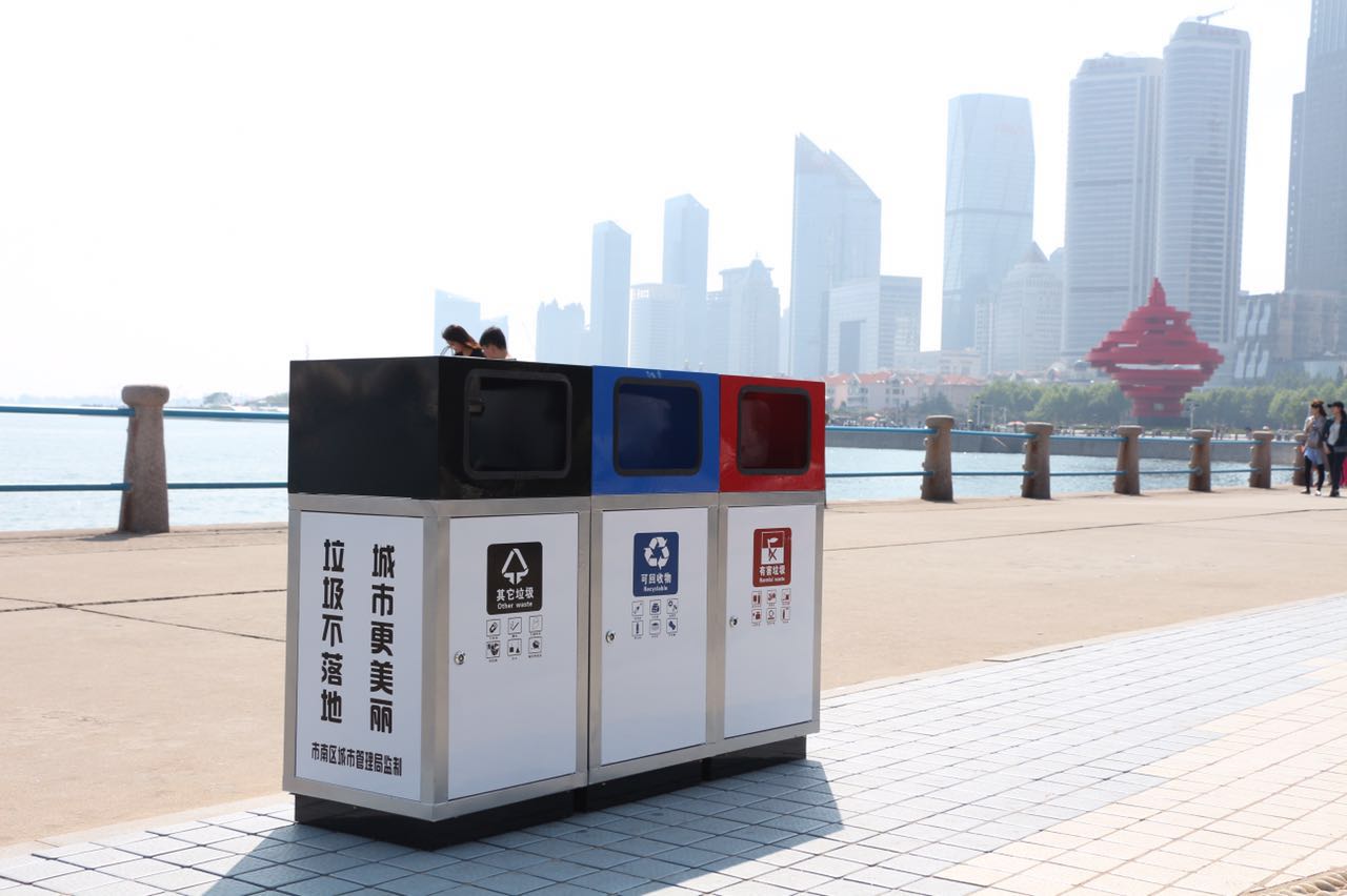 青島市市南區(qū)城市管理局工作人員王慶臣介紹說,按照全市市容市貌專項整治活動統(tǒng)一部署,市南區(qū)對轄區(qū)缺角少棱、缺桶少桶、缺株少綠的市政、環(huán)衛(wèi)、綠化設(shè)施進(jìn)行了全面排查、全面整治。此次在前海一線新更換的垃圾桶,在設(shè)計上更加注重美觀和實用,做到因地制宜、因需設(shè)置。比如根據(jù)五四廣場人流密度較大特點,專門設(shè)置了大容量組合型三分類的果皮箱,包括紅色有害垃圾、藍(lán)色可回收物、灰色其它垃圾三個箱體,極大滿足游客分類投放的需求。根據(jù)大學(xué)路、山海關(guān)路歐式建筑風(fēng)格特點,設(shè)置了與周邊建筑顏色相呼應(yīng)的二分類果皮箱,果皮箱整體呈咖啡色,色澤亮麗美觀,箱體上中式祥云圖案與周邊歐式建筑形成完美融合。棧橋海水浴場、正陽關(guān)路人行道較窄,故設(shè)置占地小的二分類果皮箱,果皮箱整體呈弧線設(shè)計,以金黃色與天藍(lán)色相搭配,不僅滿足了游客投放需求,還為沿海環(huán)境增添一抹靚麗色彩。
