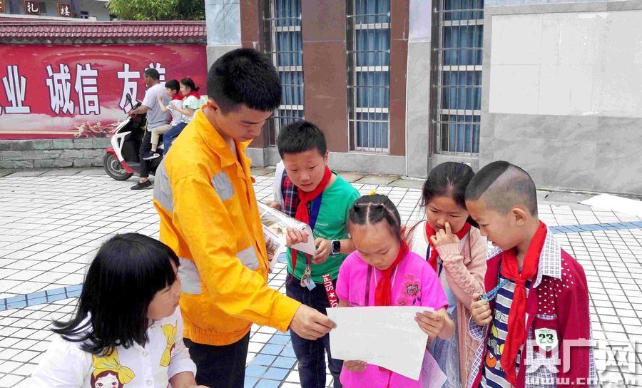 成都供電段廣元供電車間青工正在向小學(xué)生發(fā)放宣傳資料(央廣網(wǎng)發(fā) 辛志強(qiáng) 攝)