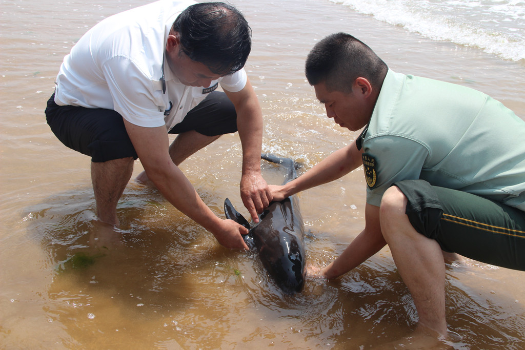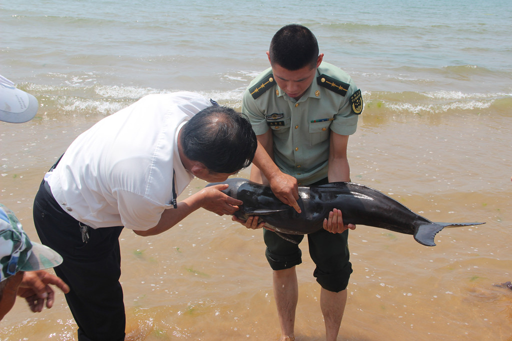 據(jù)介紹,漁民在大辛家附近海域發(fā)現(xiàn)該江豚時(shí),因長時(shí)間的擱淺和強(qiáng)紫外線照射,江豚已難以動彈。經(jīng)過相關(guān)救援人員的初步檢查和判斷,這頭江豚體長約1米5,大概一歲左右,身上有輕微的擦傷,但是不會對健康造成影響,符合放生基本條件。對此,派出所民警聯(lián)合海陽漁政工作人員協(xié)力將江豚拖進(jìn)大海放生。