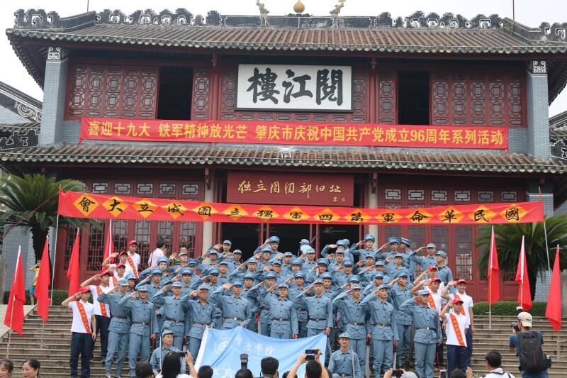 本次活動中,100名少先隊員在現場合唱《沒有共產黨就沒有新中國》,用歌聲學習先烈的革命精神,牢記先輩們的艱苦奮斗;100名肇慶學院的學生扮演“葉挺獨立團”戰(zhàn)士,在軍號聲中出場,通過操練、隊列等方式在現場實景再現了出師北伐的故事;由肇慶市委組織部和市直工委組織的100名黨員,身穿紅色黨員志愿者服裝,在主持帶讀下,重溫入黨誓詞,籍此促使每個黨員堅定理想信念,不忘初心、繼續(xù)前進。