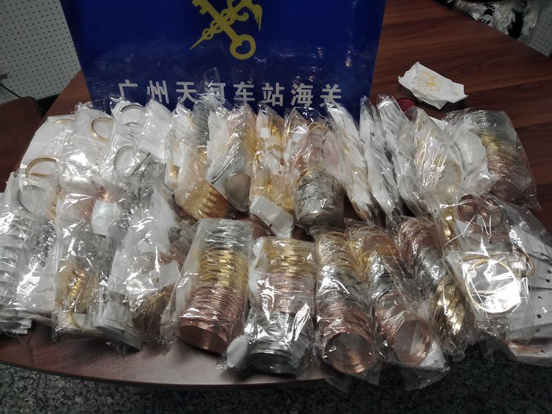 11月25日上午,天河車站海關(guān)關(guān)員在一名出境旅客隨身行李中查獲未向海關(guān)申報(bào)的“Cattier”、“Hermes”、“Chanel”、“Gucci”等知名品牌的手鐲,這批手鐲做工低劣,包裝簡(jiǎn)陋,共計(jì)482件,涉嫌侵犯卡地亞、愛馬仕、香奈兒、古馳等8個(gè)知名品牌的知識(shí)產(chǎn)權(quán)。據(jù)當(dāng)事人稱,該批手鐲總價(jià)僅3800元,無(wú)法提供相關(guān)知識(shí)產(chǎn)權(quán)證明。