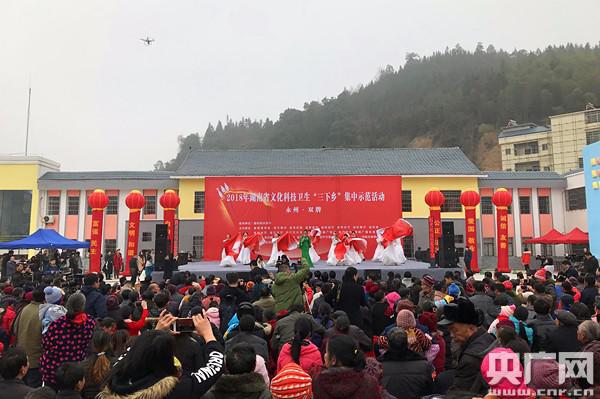 活動(dòng)主會(huì)場還上演了精彩的文藝演出,來自湖南省歌舞劇院、省雜技藝術(shù)劇院、省花鼓戲傳承保護(hù)中心、省湘劇院等多家演藝機(jī)構(gòu)為廖家村村民帶來了大型歌舞、雜技、花鼓戲等精彩紛呈的節(jié)目,現(xiàn)場掌聲連連。在另一邊,農(nóng)業(yè)科技、醫(yī)療衛(wèi)生、法律法規(guī)、出版廣電、春聯(lián)書寫等各項(xiàng)服務(wù)活動(dòng)分頭進(jìn)行。