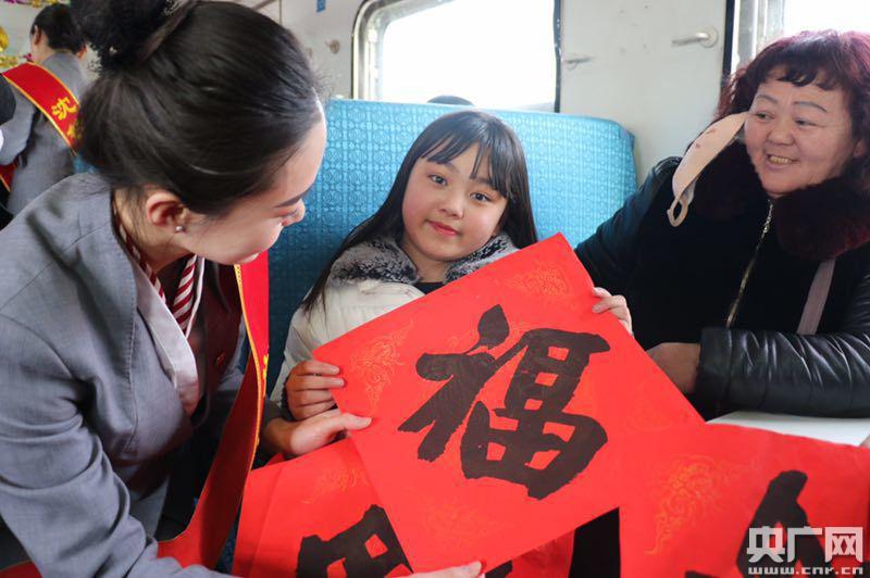 7:20分,隨著一聲汽笛長鳴,K7595次列車緩緩駛離白城站,車廂內(nèi)隨即響起青春動感的旋律。這是一趟全程運行在高寒地區(qū)靠燒鍋爐取暖的“綠皮車”。走進車廂,濃濃的年味兒迎面撲來,車窗上挨排粘著窗花、福字兒,在行李架上系著拉花和氣球,充滿節(jié)日氣氛。開車不久,車上的志愿者們開始把“!弊郑郝(lián)和春運安全手冊、暖貼等分送給旅客。旅客張先生告訴記者,這些東西不大,但拿在手上暖在心里。他說:“在外忙活了一整年,一踏上回家的列車,就收到福字,還有暖貼。禮輕情意重!