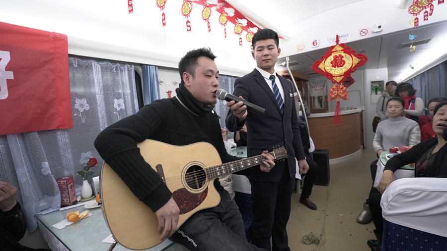 當天,為給乘車旅客營造更加溫馨舒適的乘車環(huán)境,讓旅客享受更加美好的旅行生活,列車工作人員自編自導自演,精心準備了包括相聲、小品、戲曲、歌舞等節(jié)目的“列車春晚”,為大家送上了傳統(tǒng)文化大餐。6歲的小旅客叢培悅按捺不住心里的喜悅,與列車工作人員一起載歌載舞,喜迎新年。