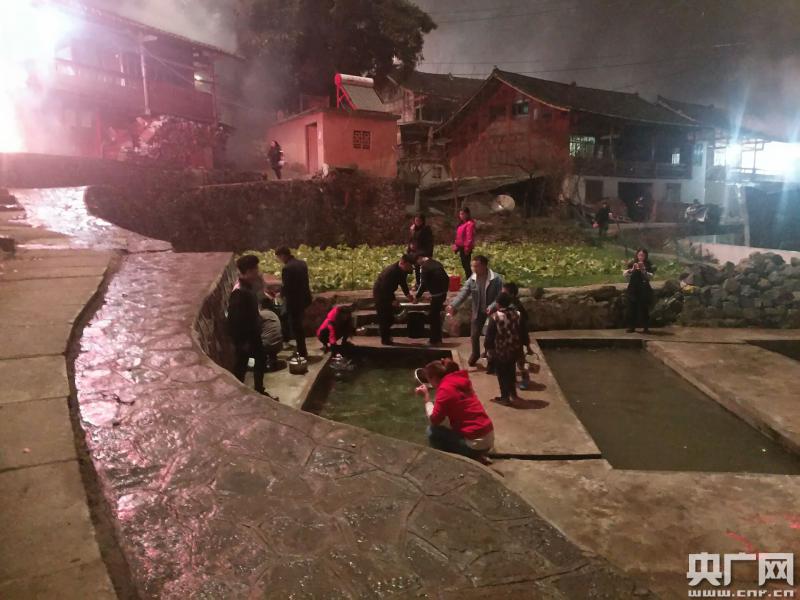 在大年三十夜子時(shí)“開財(cái)門”后,跨入新年的第一時(shí)間,歸蘭水族鄉(xiāng)水族同胞不論男女老少,都紛紛點(diǎn)著三柱香,拿著紙錢到井邊“敬井神”,拿著瓢,到水井邊排隊(duì)“吃新水”。