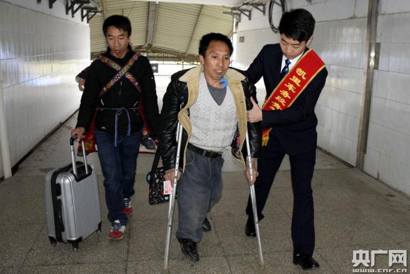 2月22日,福泉縣45歲的殘疾旅客王元付,背著大包小包的行李,拄著拐杖而來,他將返回上海務(wù)工。志愿者們看他艱難,迎了過去,接過王元付的行李,把他引向重點(diǎn)旅客候車專區(qū)。