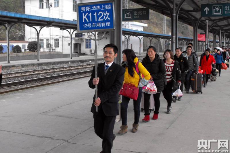 貴州省福泉火車站的春運(yùn)客流高峰來得早,旅客拖家?guī)Э、或結(jié)伴而行,車站站臺上,返程的景象一片忙碌路。