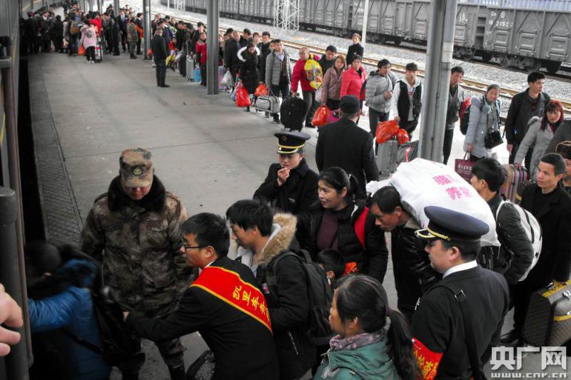 引導(dǎo)旅客有序文明上車(央廣網(wǎng)發(fā) 姜澤鵬攝)