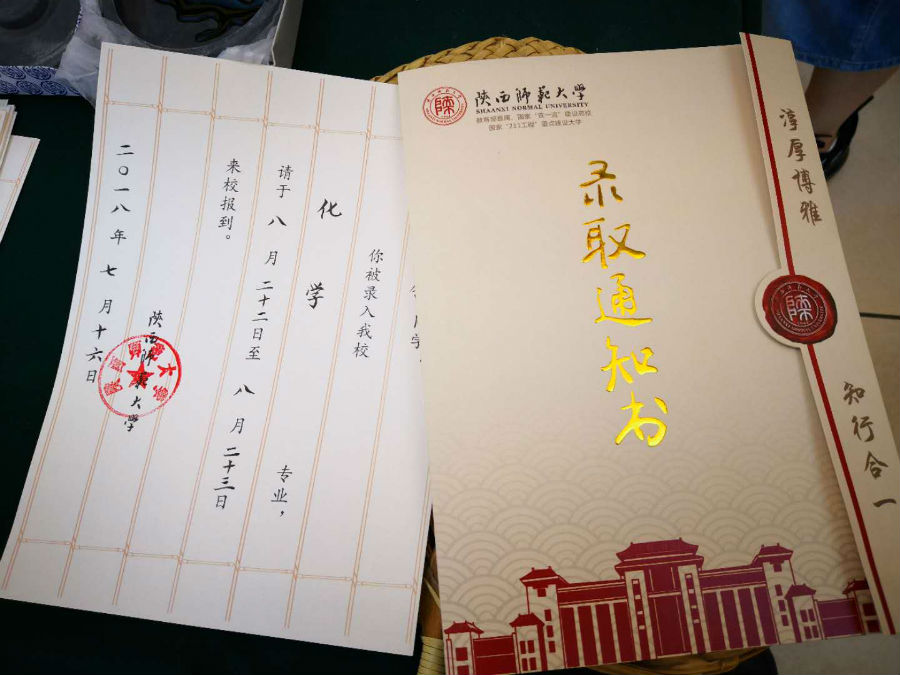 今年為進(jìn)一步增強(qiáng)手書錄取通知書的收藏價值,使其能夠更好的與“毛筆手書”這一特性融合,陜西師范大學(xué)經(jīng)過前期公開征集,專家評選,最終確定了陜西師范大學(xué)新版本科生錄取通知書。通知書將陜師大與歷史悠久的十三朝古都西安緊緊聯(lián)系在一起,宣紙材質(zhì)、漢封泥印、剪紙剪影、祥云底紋等設(shè)計凸顯了陜西獨(dú)有的歷史文化印記,古樸優(yōu)雅。