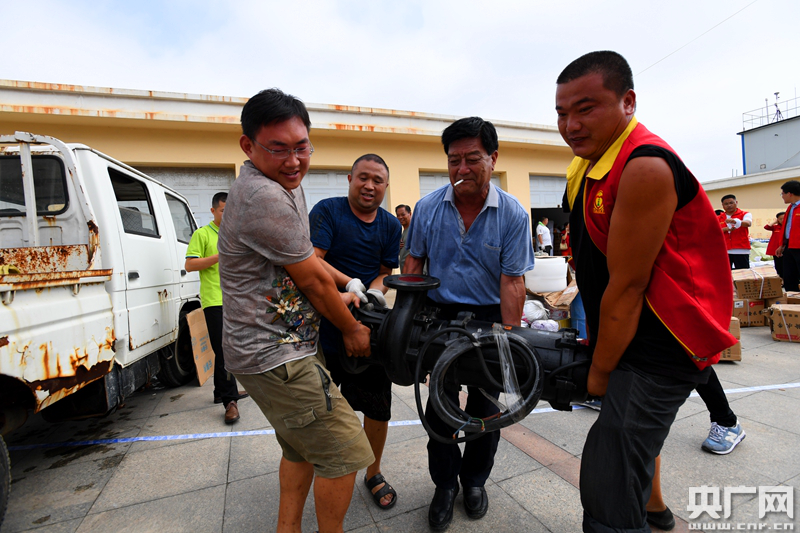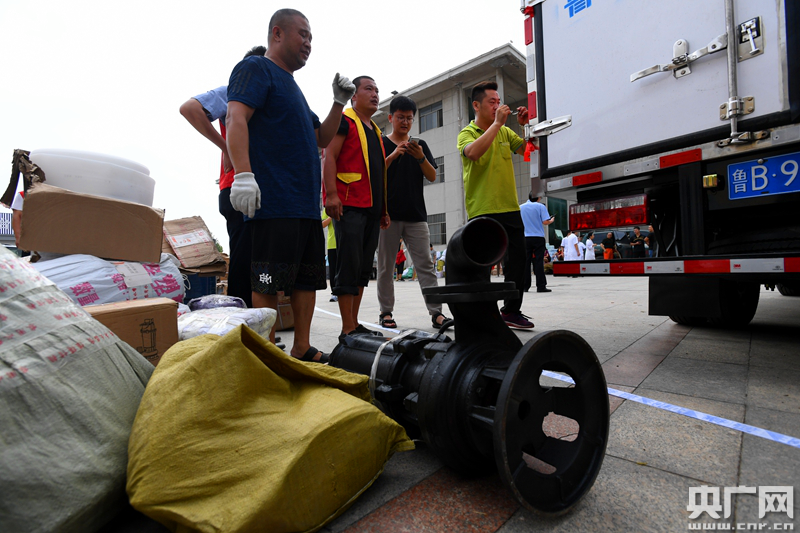 28日上午,貨車?yán)仍镔Y先來到了紀(jì)臺鎮(zhèn)救援物資接收點(diǎn),記者在現(xiàn)場看到,偌大的院子里已經(jīng)堆積了不少的救援物資,愛心企業(yè)還為紀(jì)臺鎮(zhèn)送來了一臺大功率排污泵。(央廣網(wǎng)發(fā) 通訊員劉延珉 攝)