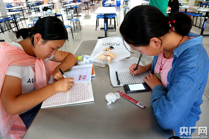 兩名初二的學(xué)生志愿者在搬運(yùn)物資的休息間隙寫作業(yè)。(央廣網(wǎng)記者 唐磊 攝)