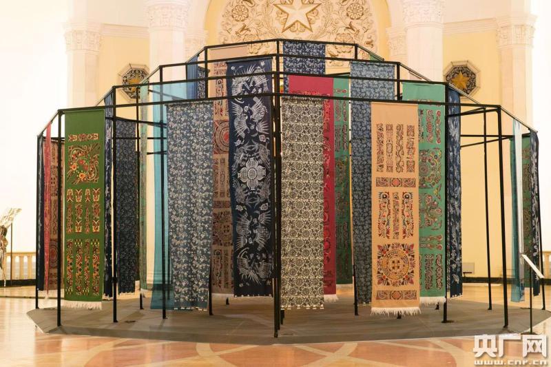 一走進(jìn)上海展覽中心,沉浸式公共藝術(shù)裝置《百鳥林》便吸引了眾多人的目光,置身林間,鳥鳴啾啾,令人難忘。《百鳥林》如其名,匯集了各種鳥類形象,而這些形象與眾不同,它們運(yùn)用了大江南北四種非遺織染繡藝,分別是藍(lán)印花布、丹寨蠟染、阿壩羌繡、苗族百鳥依,營造了一個(gè)非遺傳統(tǒng)手工藝的鳥林天堂,行走其中,鳥鳴聲聲,此起彼伏,宛若在百鳥啼鳴的森林中穿梭,意趣盎然。上海大學(xué)上海美術(shù)學(xué)院副教授上海公共藝術(shù)協(xié)同創(chuàng)新中心運(yùn)營總監(jiān)章莉莉介紹,這個(gè)裝置里面一共有兩位國家級(jí)傳承人的共同合作,還有一位是丹寨蠟染的老師,張居悅老師,“我們用合作的意識(shí),探索的精神,去實(shí)踐非遺傳承的創(chuàng)新的道路!