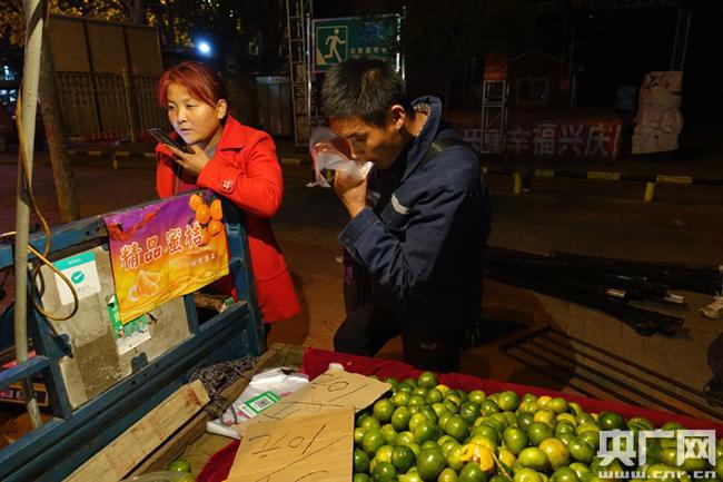 魏文軍用牙齒撕開塑料袋賣水果。(央廣網(wǎng)記者 徐升 攝)